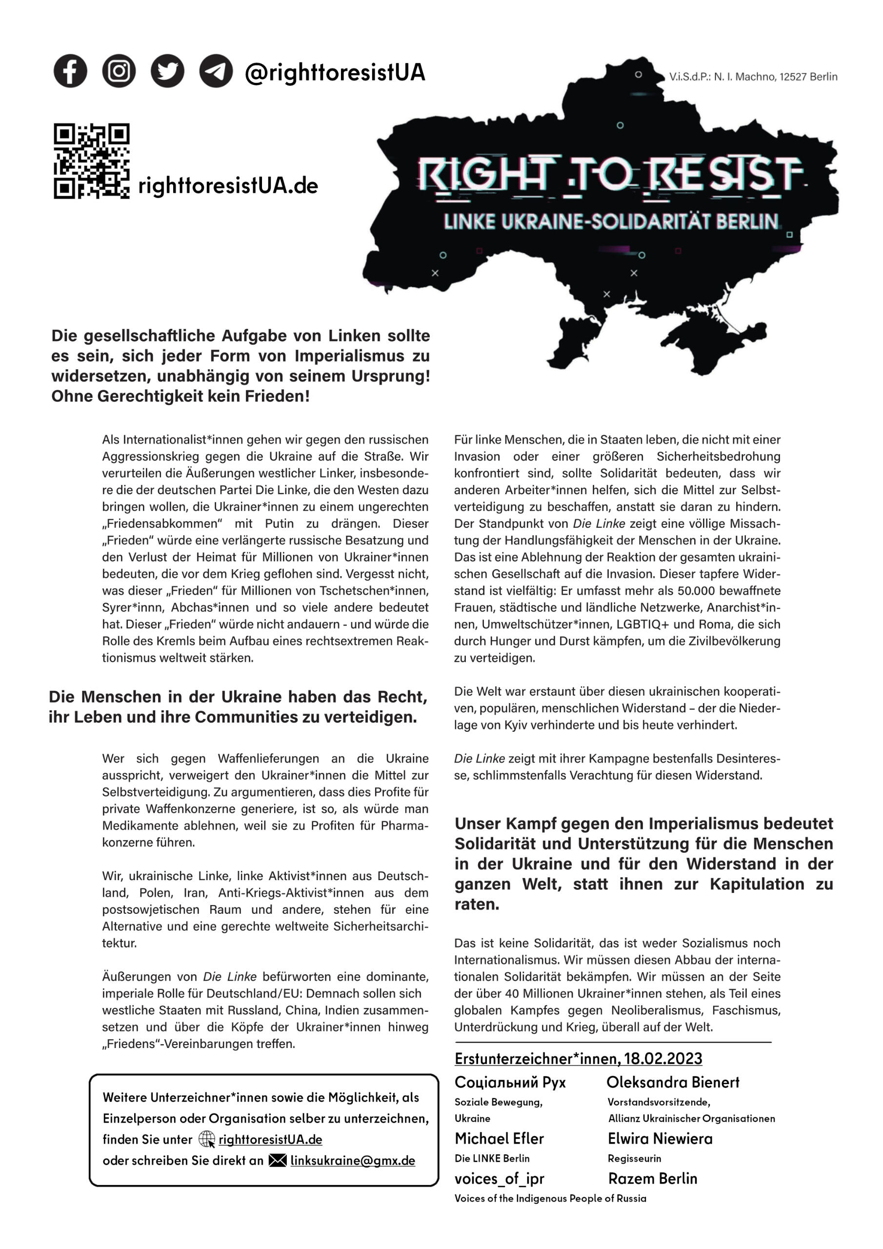 For the Right to Resist – Linke Ukraine-Solidarität BerlinWir demonstrieren in einer Welt mit explodierenden, einander überlagernden Krisen und suchen – zusammen mit Klimabewegungen, sozialen Bewegungen, Aufständischen des globalen Südens, mit so vielen in der Welt – nach solidarischen Lösungen, nach einem Weg, die Katastrophen, die von der herrschenden neoliberalen Politik ausgelöst werden, gemeinsam zu besiegen.Der Ökologe Mykhailo Asimov von der ukrainischen Organisation Ecoaction, beschreibt den unermesslichen Schaden für die Umwelt, der durch Russlands Krieg ausgelöst wird, ein Klimakrieg, der gezielt gegen Nahrungsmittelvorräte, Getreidefelder, gegen Bauern und Höfe, gegen eine Umwelt geführt wird, die alle auch von fundamentaler Bedeutung für die Ernährung der Welt sind. Zusammen mit der Forderung nach einem grundlegenden Systemwechsel weist er darauf hin, dass die Ursachen von Kriegen und auch planetarer Zerstörung in fossilen Brennstoffen zu suchen sind. Das Wachstum der Abhängigkeit des westlichen Kapitals von billigerem Gas und Öl habe ein Monster anwachsen lassen, sagt eine polnische Sozialistin. Hierin spielt Deutschland in der ersten Liga (man erinnert sich an Schröders Umarmung mit Putin, als dieser die Hälfte des tschetschenischen Volkes in einem Eroberungskrieg massakrieren ließ, und das dann in Syrien weiterführte). Aber Putins Regime ist nicht nur diktatorisch im Inland, sondern auch eine wichtige Stütze und Zahlmeister für alle Nazis und rechtsextremen Bewegungen in der ganzen Welt.Wer angetreten ist, all dies zu bekämpfen, steht auf der Seite des ukrainischen Widerstands. Beeindruckend und vielfältig ist der Widerstand in der Ukraine: feministische Gruppen, anarchistische Kooperativen, Kiez-Nachbarschaften, Stadt-Land-Vernetzungen, ArbeiterInnenbewegungen und Gewerkschaften organisieren den Kampf und das Überleben von vielen. Inmitten eines brutalen Krieges melden sich LGBTI*, Frauen, Roma-Menschen und soziale AktivistInnen und fordern ihre Rechte. Insbesondere ArbeiterInnenorganisationen stehen, in Solidarität mit internationalen Gewerkschaften, in einem Kampf gegen neoliberale Verschlechterungen, gegen Oligarchen im Inland und im Ausland, gegen Kräfte, die die Ukraine als Billiglohnland mit ArbeiterInnen ohne Arbeitsrecht haben wollen.Sie alle stehen für das Verteidigungsrecht der Ukraine, für den zivilen oder bewaffneten Widerstand. Trotz allen Leids ist der Wille zum kompromisslosen Widerstand enorm. Die Ukraine hat diesen Krieg nicht gesucht oder gewollt. In den russisch besetzten Teilen des Landes herrschen Not, Hunger, Folter, Vergewaltigung, Deportation von Kindern, Verschwindenlassen von staatlichen Angestellten und GewerkschaftlerInnen, von allen, die nicht schweigen; Schulkinder sollen nicht mehr Ukrainisch sprechen, und in den Kindergärten werden Zurschaustellungen des „Z“ mit Kleinstkindern organisiert. Sie werden von anderen UkrainerInnen, die in relative Sicherheit geflüchtet sind, nicht im Stich gelassen.Wer eine bessere Welt will, steht in Solidarität mit dem Widerstand, bewaffnet und unbewaffnet, in der Ukraine. Du und wir wollen internationale Solidarität und gegenseitige Unterstützung aufbauen. Wir laden Euch ein, mit uns zusammen zu diskutieren, wie wir das am besten machen können.V.i.S.d.P.: N. I. Machno, 12527 Berlin