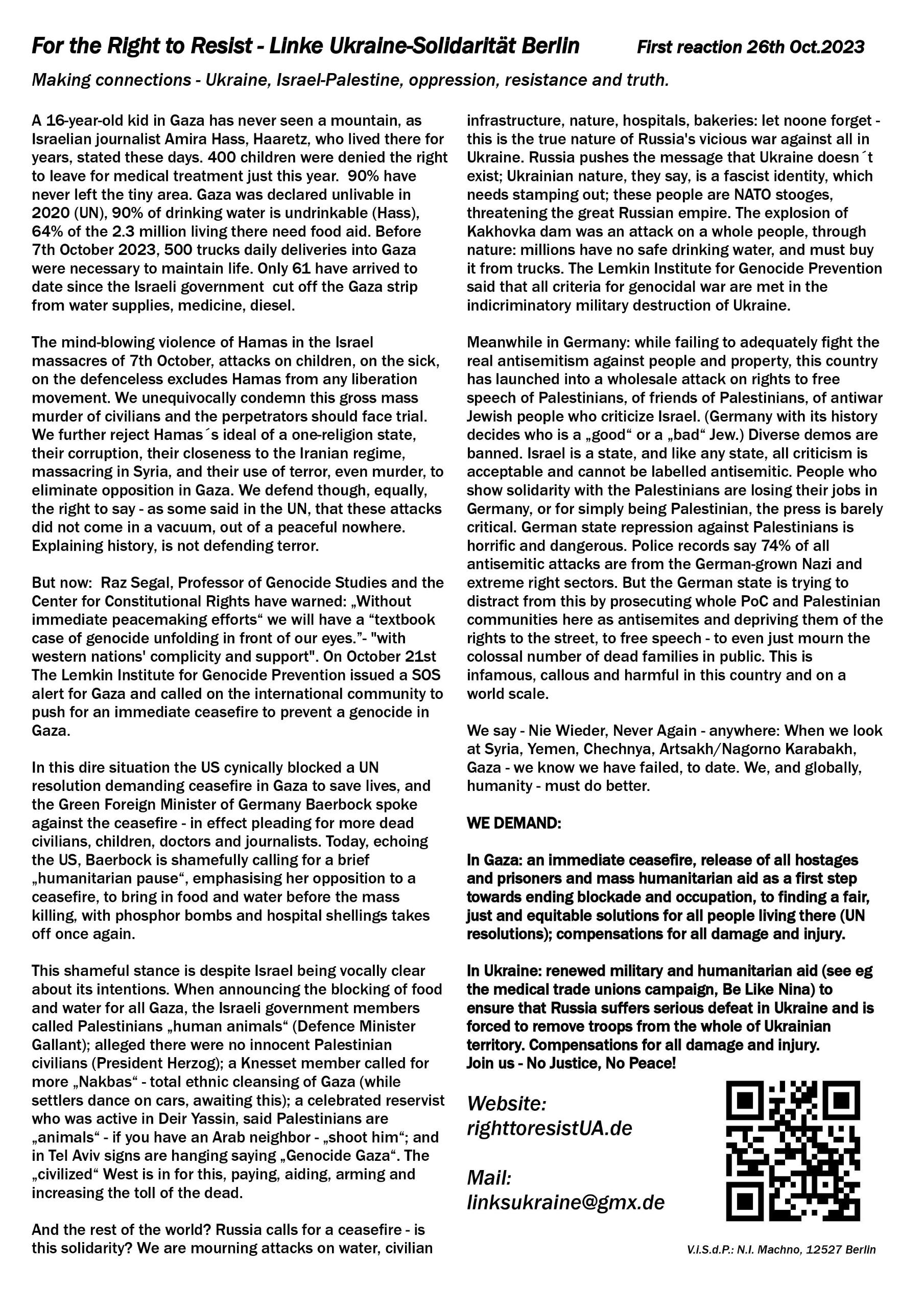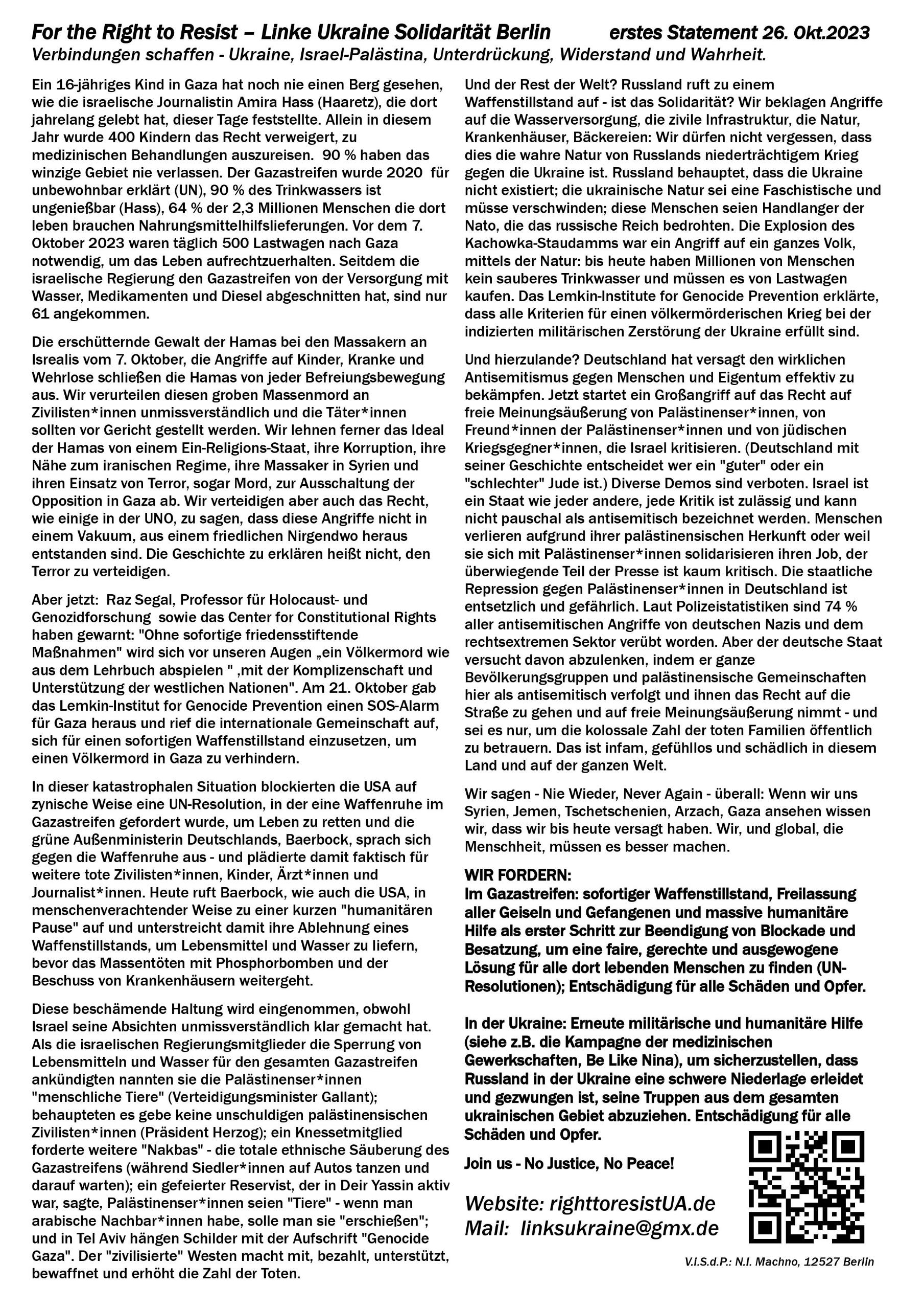 For the Right to Resist - Linke Ukraine Solidarität BerlinSTOP BRUTAL OCCUPATION AND GENOCIDAL WAR - EVERYWHERE!STAND WITH THE UKRAINIAN RESISTANCESTAND WITH WORKERS AND TRADE UNIONS - DRONES SAVE LIVES