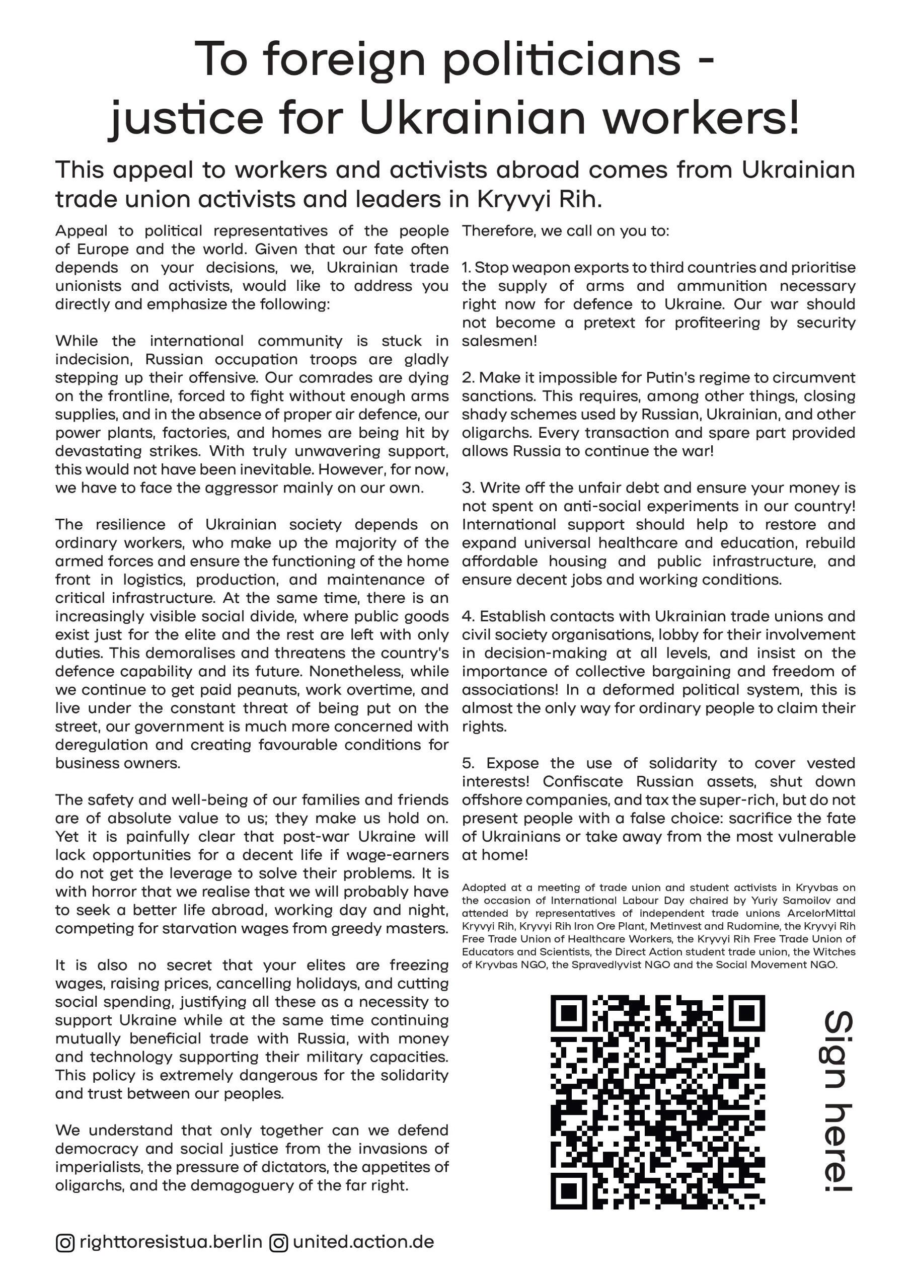 First signatories/ErstunterzeichnerInnen:Sotsіalniy Rukh / Соціальний РухAnti-authoritarian volunteer network Solidarity CollectivesFemSolution, KyivFeminist Lodge, Kyiv